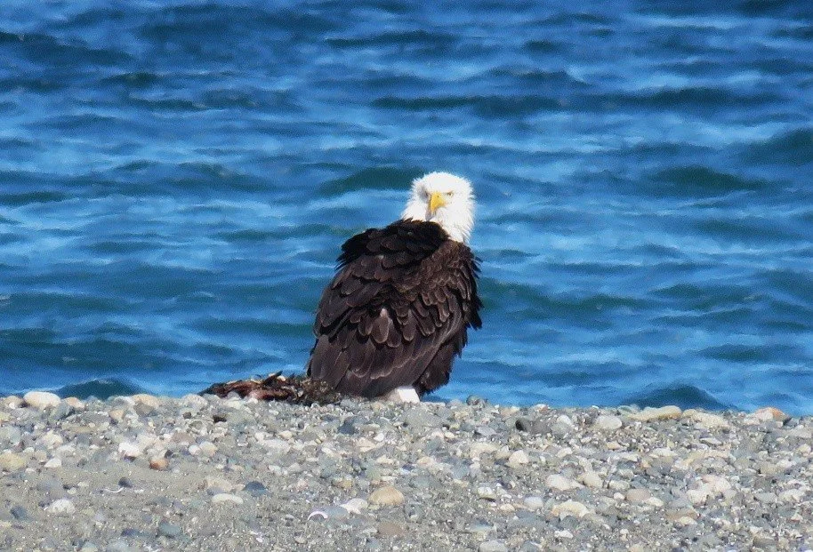 You might see an eagle high overhead if you stop at Coffin Pond to see if there are any geese or heron, but if you really want to see eagles, you should go to one of the beaches along the eastern coast of Vancouver Island. Out there, eagles are about as common as sea gulls on Cape Cod. When you walk out onto the rocky beach, an eagle might even turn its head, look closely at you, and seemingly invite you to sit down and enjoy the view.