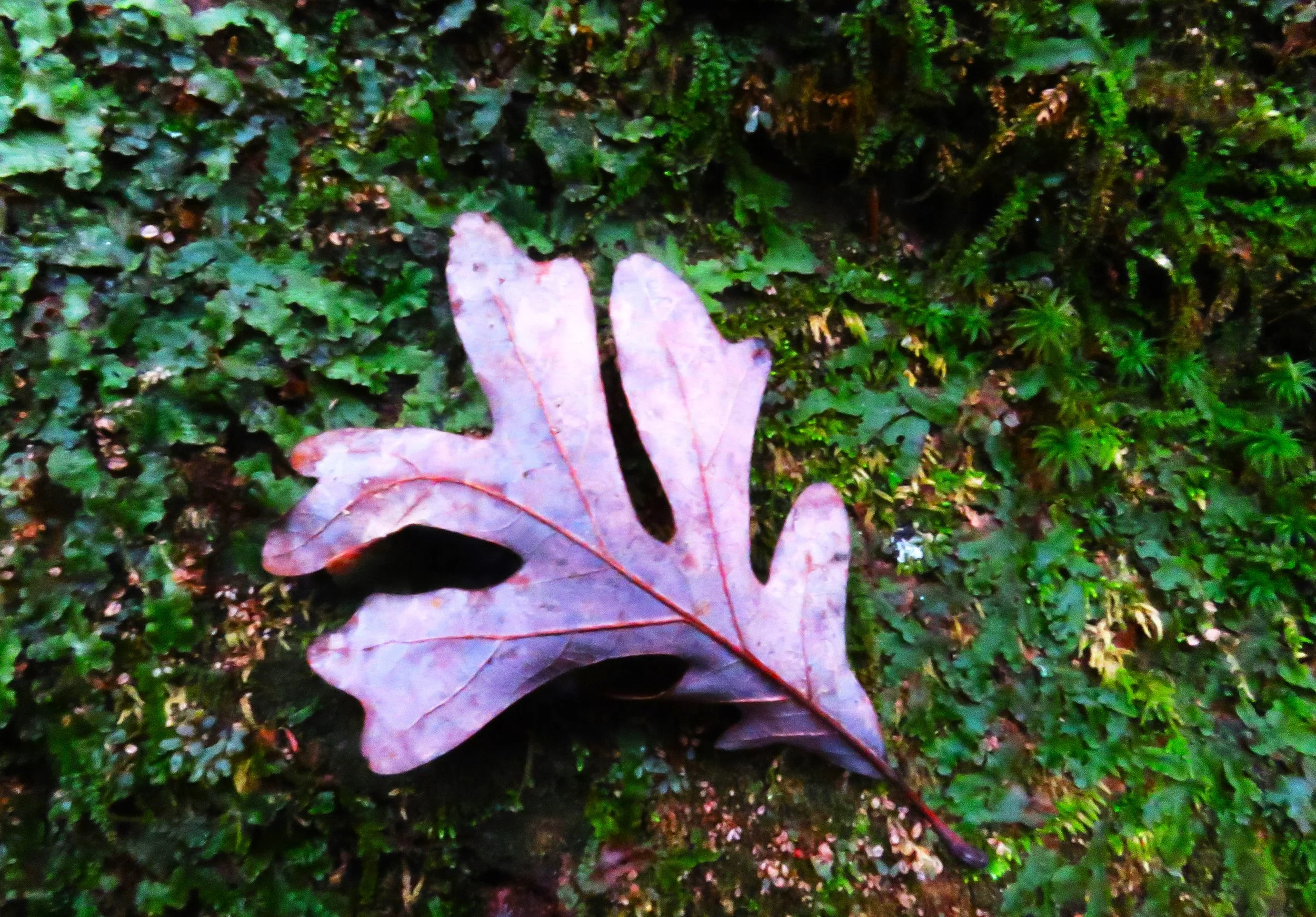 One leaf at a time: a lovely leaf of a burr oak on a moss-covered rock at the side of a little rivulet.