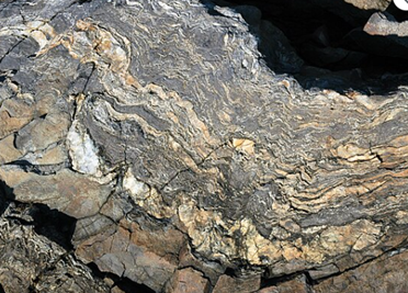 Metamorphic rocks are formed when existing rocks are forced so deep underground that they experience intense heat and pressure for a long period of time. Because of the heat and pressure, the rock is molded, folded, squished, and rearranged, like when you roll playdough between your hands. A common metamorphic rock in New Hampshire is gneiss, which you can see in the pictures below.