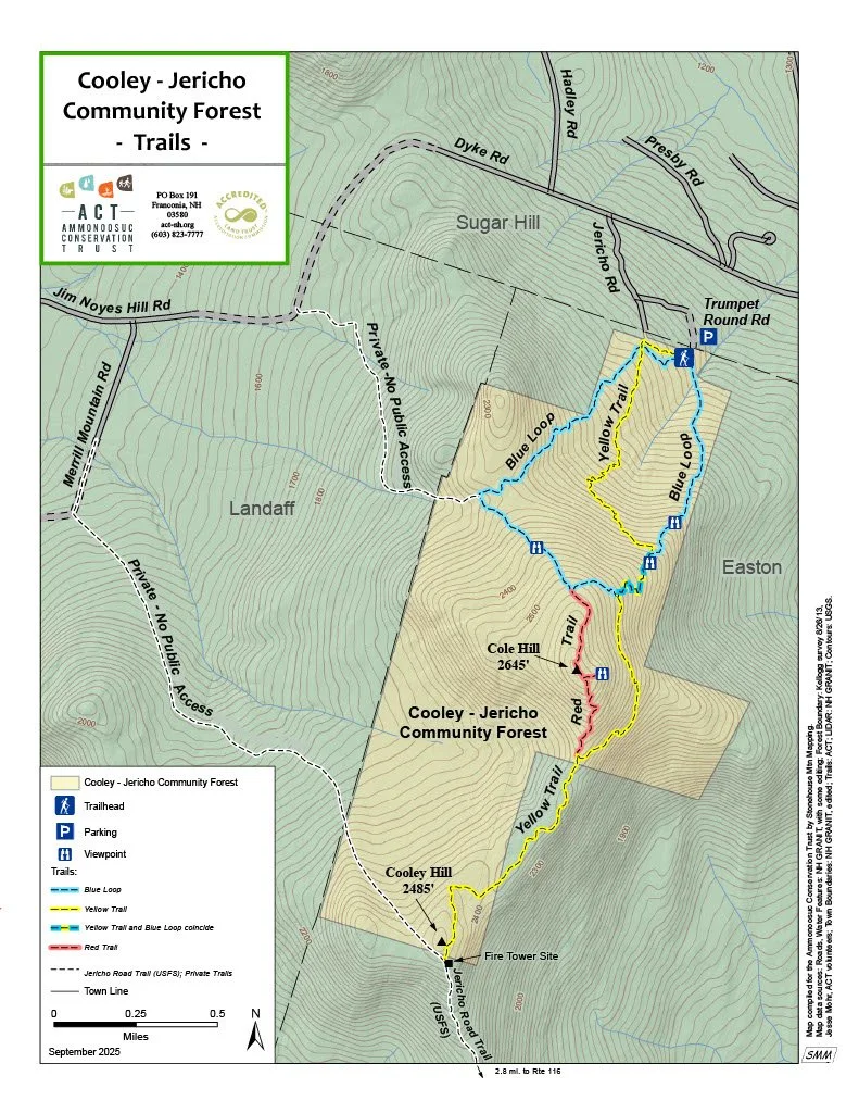 The trails at Cooley-Jericho can be enjoyed in a handful of ways including hiking, mountain biking, snowshoeing, backcountry skiing, and wildlife observation. Portions of the Blue Loop and the Red Trail are also used by snowmobilers. Please be aware - hunting is allowed in the Community Forest.
